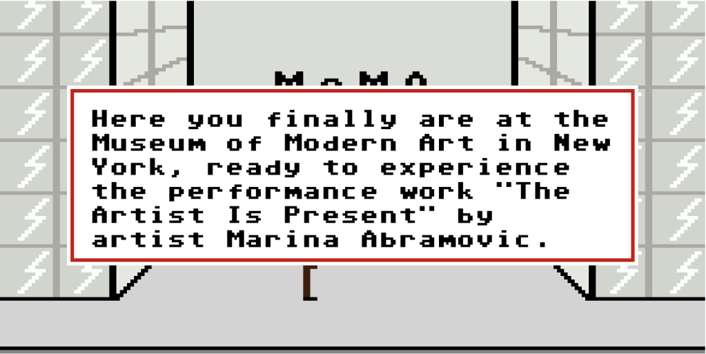 And don’t get too antsy: if you start “pushing” the person in front of you (pressing the forward key while in line), your neighbor will complain, and eventually you’ll get kicked out – and have to start all over again. Likewise, if you get bored of waiting in the virtual line and wander away from your browser window, you might miss the line advancing, and lose your spot when those behind you get impatient. What might the experience of being “present” with the virtual performer be like? Can it possibly live up to the hype of the original? It probably can’t, nor can Barr intend it to. I can’t say for sure, though, as I’ve yet to make it that far in the game – but the real-life museum visitors who waited in the real line at the real MoMA didn’t know, either. In a busy, modern city like New York, people often have to decide which lines are worth waiting in, whether it be for a once-in-a-lifetime art experience, a seat in the audience of Saturday Night Live, or a slice from a famous pizza place. Conventional forms of documentation have difficulty registering these nebulous yet central aspects of the audience’s experience, which ties Abramović’s piece to the place and time of its original performance as surely as her earlier works were rooted to their historical moments. Intentionally or not, Barr has captured something fundamental about this important performance. Might there be room in the conservation of performance for games like Barr’s?