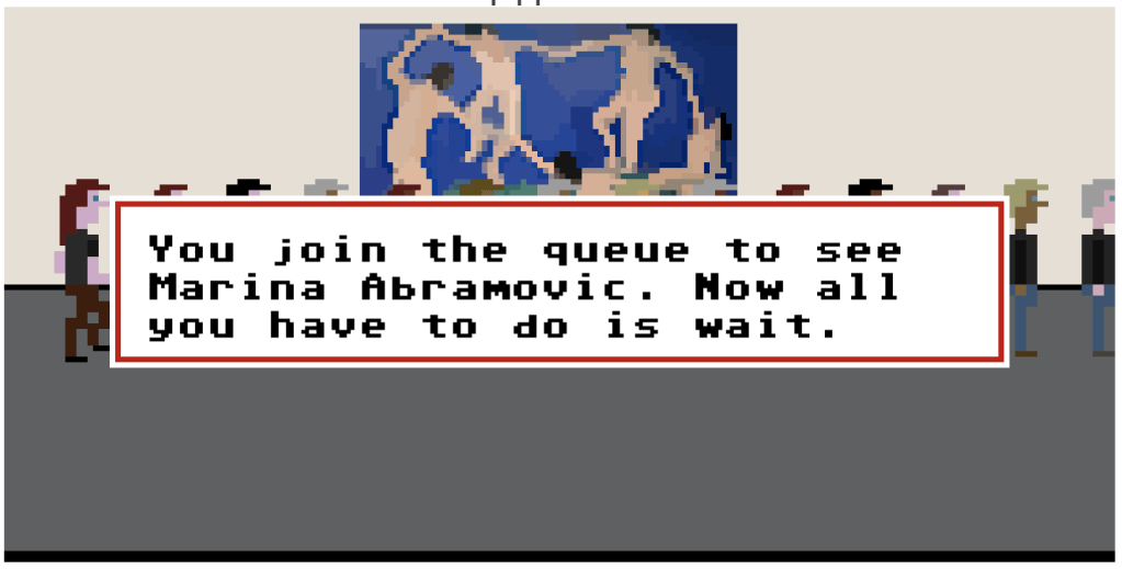 The game, with its simple graphics that recall old 8-bit games like Police Quest, is not a very convincing simulation of reality. It doesn’t even attempt to render the museum’s architecture realistically, though it does include a few pixelated masterpieces of MoMA’s collection. (Plus, Barr’s MoMA charges your avatar $25 for entry, while MoMA’s tickets only cost $20 in 2010.) It can’t even hint at the intense interpersonal connections that the performance generated; this irony is part of Barr’s point. And yet, Barr’s game reproduces arguably one of the most fundamental – if unintentional – characteristics of Abramović’s piece: the line.