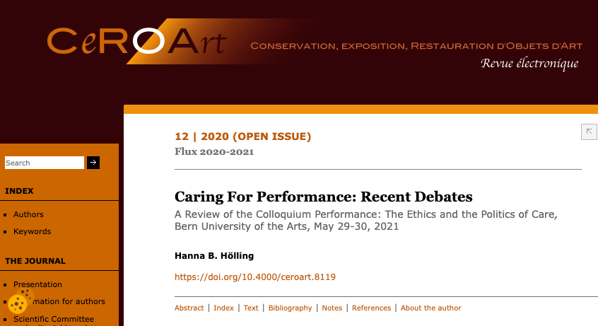 This reformulation of the identity of carers—conservators’ and custodians’ and other participants in conservation as cultural practice—became evident during the colloquium Performance: The Ethics and the Politics of Care, organized at Bern University of the Arts on May 29-30, 2021 within the research project Performance: Conservation, Materiality, Knowledge (SNSF 2020-24).10 Two days of lectures and discussions, enhanced by an additional panel on June 10, made apparent the conservators’ entanglement with the world and the way in which the conservation’s cultural-technical practice is embedded in larger institutional and social systems. While re-enacting some motifs of performance conservation as an act of keeping the discourse alive while passing it on (in the sense of Rebecca Schneider’s proposition that re-enactment is an act of survival), the colloquium combined emic and etic approaches to the studies of the field (emic and etic are notions adapted from anthropology). Learning from the culture through the lens of the culture in the case of the emic approach and applying an observer perspective in the case of the etic approach, the colloquium demonstrated an unquestionable urgency of the topic in the times when cultural institutions increasingly collect performance, appreciating it not only for its momentary, short durational characteristics, but also for its ability to remain, differently, in collections. The voices represented in the colloquium and the panel also manifested how, through the lens of conservation, new light might be shed on the discourses of the actualizations, or afterlife, of performance.11