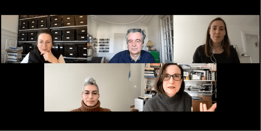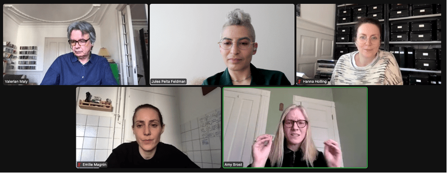 Our first guest, performance scholar Heike Roms, is currently launching a fascinating research project on the sound documents of performance art, Toward an Aural History of Performance Art.[1] Sound documents, she explained us, include audio recordings of live performances but also other types of recordings such as interviews, or sound elements that were part of a performance. Thanks to the relational nature of sound, these recordings have the capacity to complement and even challenge visual documentation, and to offer a different understanding of performance art. But she goes even further by suggesting that the unique properties of sound could also open up new paths for thinking about performance’s capacity for reappearance: If sound never disappears but rather keeps on reverberating (as recent debates in fields such as acoustic archaeology suggest), does it mean that a performance never completely disappears?
