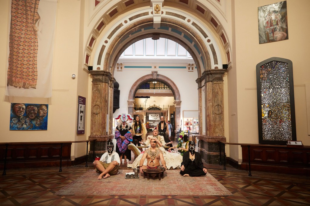 Rosanna Raymond, born in Aotearoa (New Zealand) in 1967, has a multifaceted practice that encompasses performance, institutional critique, fashion, writing, curation, and pedagogy. Her work mediates Pacific Islander culture between museum and living tradition, academy and nightclub. Raymond received the Arts Pasifika’s 2018 Senior Pacific Artist Award, and is a member of the New Zealand Order of Merit. She has exhibited and presented her work in many institutions and communities around the world. Raymond’s performances—interventions into museum storerooms and crowded sidewalks—not only expose and critique the colonialism of traditional Western museum practices of conservation, collecting, and display, but also propose other methods for keeping culture alive, through inherited tradition, personal innovation, and embodiment. Her work, both independently and as a member of the collective Pacific Sisters, honors and extends the traditions she has inherited from her ancestors—Raymond has Sāmoan, Tuvaluan, Irish and French heritage—while insisting on Pacific Islander culture as modern, dynamic, hybrid, and individual. A formative early work is G’nang G’near (1993), which began life as a pair of Levi’s jeans and denim jacket that Raymond embellished with scraps of traditional, decorative tapa barkcloth that she found discarded when people cleaned out their homes. Raymond wore G’nang G’near in art, fashion, music, and social settings before the outfit was accessioned into a museum collection. For Raymond, all heritage, whether tangible or intangible, is alive, and thus requires living performance and reembodiment for its continued flourishing. Her 2021 master’s thesis, “C o n s e r . V Ā . t i o n | A c t i . V Ā . t i o n: Museums, the body and Indigenous Moana art practice,” addresses both practical and theoretical models for conserving Pacific Islander heritage in museums through performance.