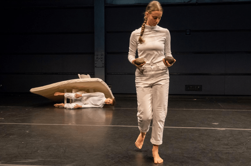Pamplona Stones was created and performed in 1974 by Trisha Brown and Sylvia Palacios Whitman. Their humorous eighteen-minute duet consists of serial actions carried out in a nonchalant, deadpan style with a variety of props, accompanied by flat, monotone speech. The objects include two palm-sized rocks, a provisional tent-like structure with a sheet and two poles, and a small mattress, which they arrange and rearrange to make visual and verbal puns. Brown described the work as “a careful distribution of words, objects, and gestures in a large square room with an interplay of ambiguity in language and reference—a multiple theme and variations.”[1]