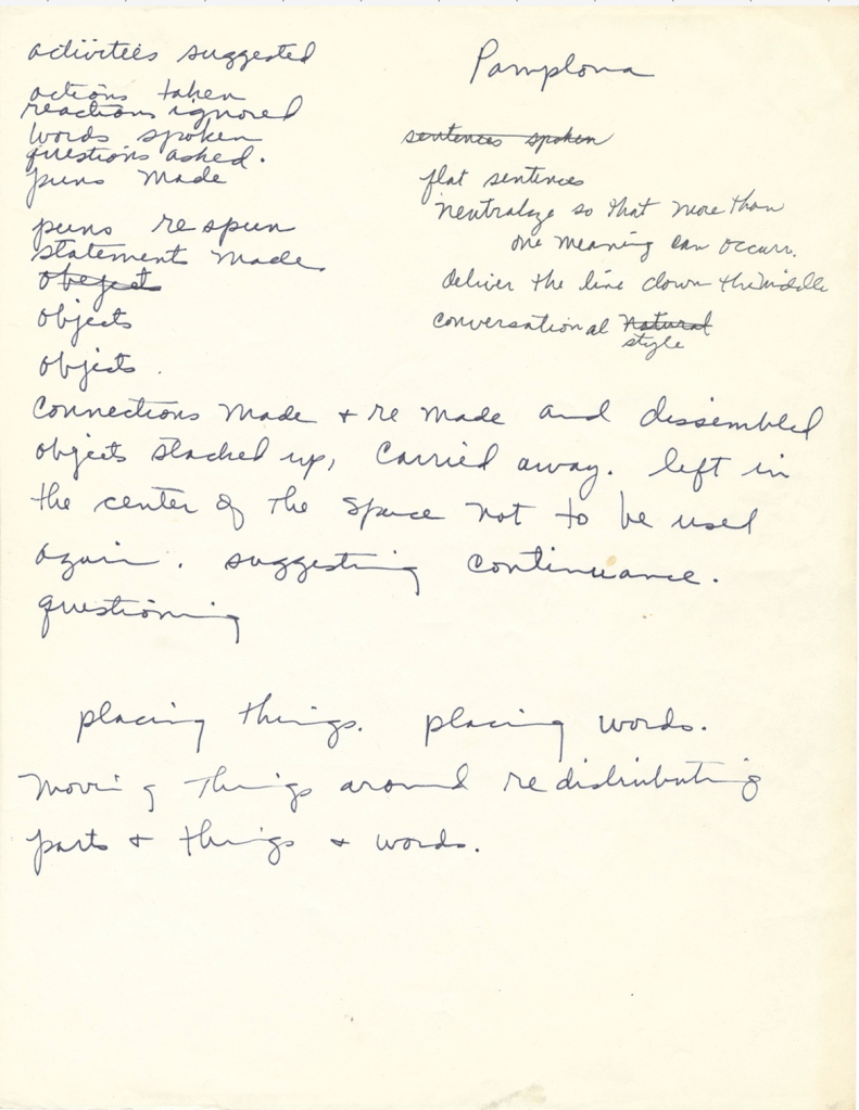 I used improvisation to unearth the logic of the work, and to help make this more internal to the performers’ own sensibilities. In my practice in general, the possibilities of language have become essential to the way that I reconstruct performance works. For Pamplona Stones, I used a writing practice called “Rinse and Repeat,” that was inspired by Trisha’s own poetic use of language in her notebooks, which I transmitted to the performers as a way to elicit a thicker description and to attune to the humor. First, a segment of video is observed, then one performer moves continuously for 1-3 minutes. The other performer observes, using free association to describe what they are seeing in writing. At the end of the time period, the observer chooses a few resonant images from their writing as a score for movement. Then, the participants switch roles and the process is repeated.[8]