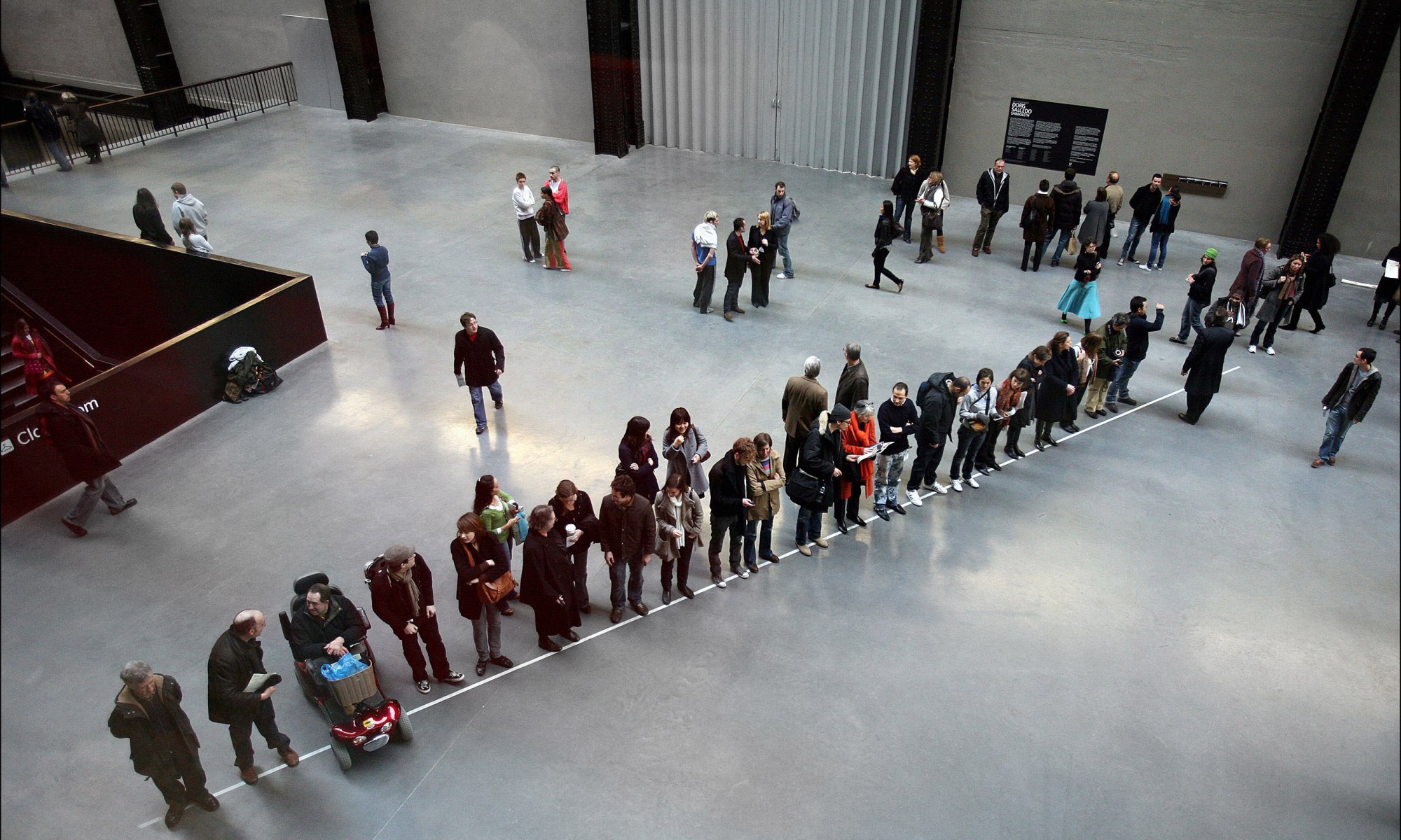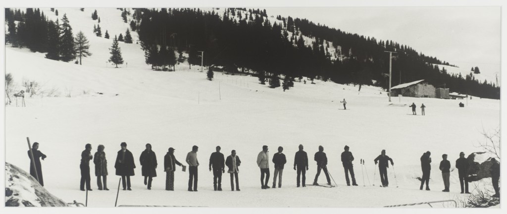 The artwork Time (1970) by David Lamelas exists in Tateโscollectionastwo manifestations, each with their own accession number. One is a silver gelatin phoยญtograph and the other is a live performance work. The photograph documents the ๏ฌrst performance of Lamelasโs Time 1970 in the French Alps (Figure 1.1). The instructions for the live performance work are simple and ๏ฌexible: a group of people stand in a line; the ๏ฌrst person tells the time to the next person; they โreceiveโ the time and โhold on to itโ before announcing it to the next participant; the last person announces it โto the worldโ in the language of their choice. The work has been performed in numerous locations, from outside in the French Alps as shown in the photograph (Figure 1.1) to the Turbine Hall in Tate Modern (Figure 1.2) to recently being performed on Zoom and live streamed on YouTube in 2020 (Figure 1.3). The performance of the work has also adjusted to the di๏ฌerent devices for telling the time, from wrist watches to mobile phones to computer clocks.14
