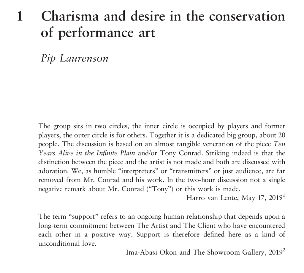 My ๏ฌrst encounter with Ten Years Alive on the In๏ฌnite Plain as a collection care specialist and a conservator was a performance of the work in the Tanks, a performance space in Tate Modern, on January 18, 2017, approximately nine months after Conradโsdeath.20 Thanks to the foresight of the curators Andrea Lissoni and Carly White๏ฌeld, this performance provided a moment to bring some of the network of people that surrounded Ten Years Alive on the In๏ฌnite Plain together to co-create the way in which the work might continue without Conradโs presence as its primary instigator, transmitter, teacher and ๏ฌrst violinist. There was therefore no doubt that in order to think about how this work might enter Tateโs collection we needed to consider and develop an understanding of that social network and its evolving role in sustaining Ten Years Alive on the In๏ฌnite Plain.