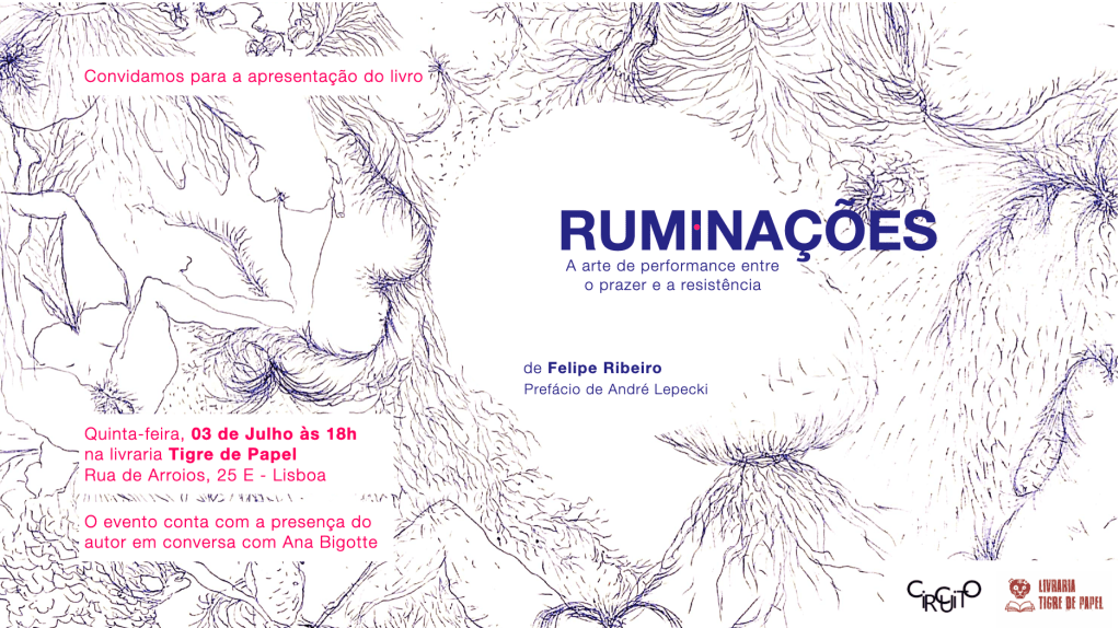 Felipe’s book, Ruminações: a arte de performance entre o prazer e a resistência, originally released in Brazil in 2022, has now been reedited and published in Lisabon. The book launch takes place on July 3rd at 6pm at Tigre de Papel Bookstore, in Lisbon.
